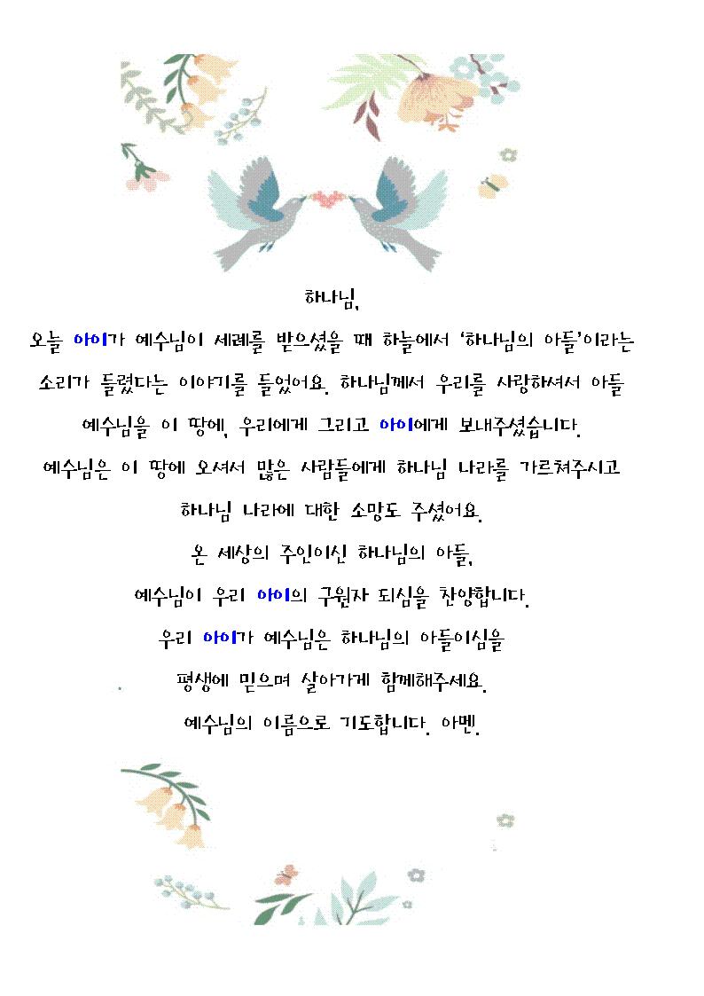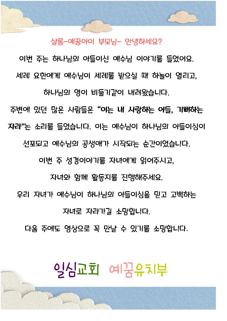 20210207 일심교회 유치부 온라인 주일예배 제목: 하나님의 아들 예수님 말씀:마 3:13-17 핵심내용 - 예수님이 세례를 받으실때 하늘에서 성령이 비둘기 같이 임하고 하나님의 음성이 들렸어요. - 예수님은 하나님의 아들이세요. - 우리는 하나님의 아들 예수님을 믿으며 살아가요!
